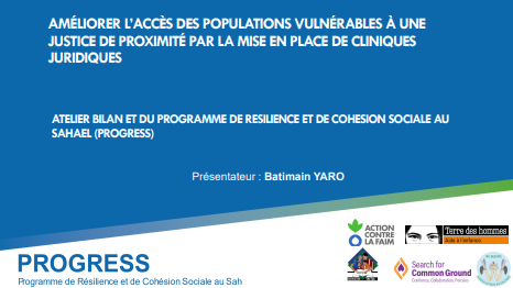 Les cliniques juridiques sont implémentées par la fondation Terre des hommes-Lausanne dans le cadre du Projet de résilience et de cohésion sociale au Sahel (PROGRESS). Les missions de la clinique j
